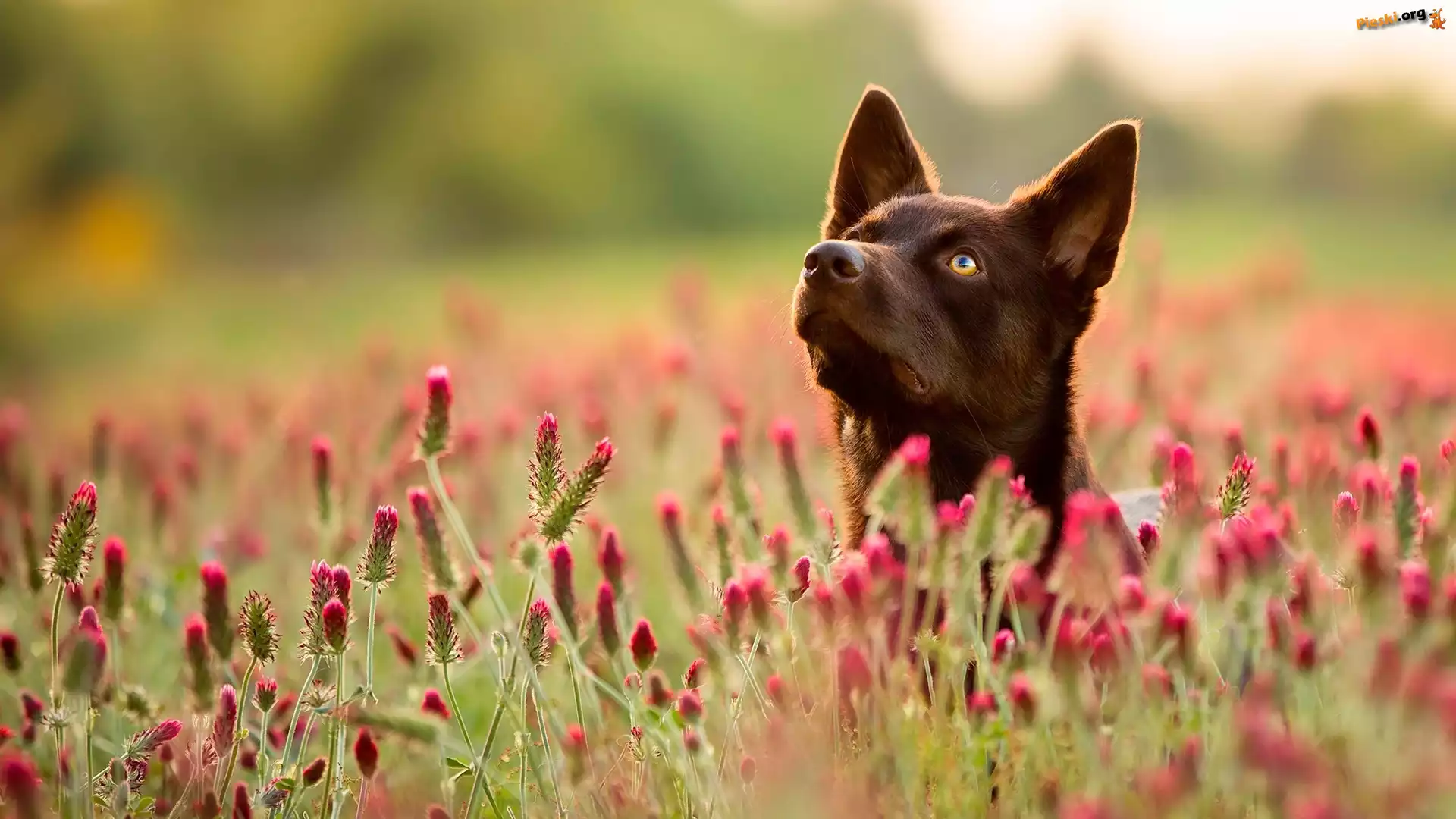 Łąka, Mordka, Pies, Owczarek australijski kelpie, Kwiaty