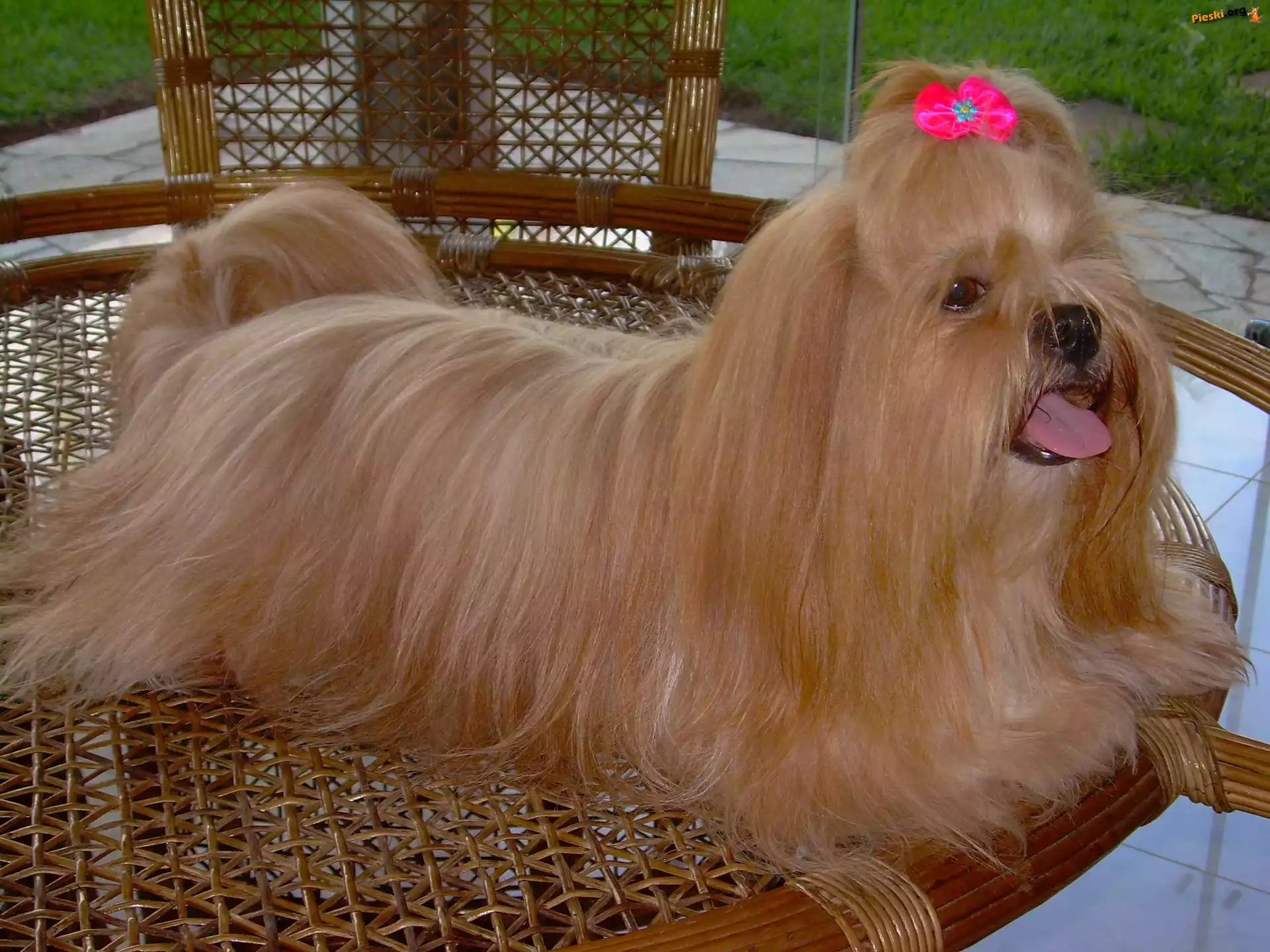 Pies, Różowa, Gerbera, Lhasa Apso Lhasa Apso, kokardka wyczesany, Lhasa Apso Lana Del Rey, Pies, Lhasa Apso Malutki piesek, Lhasa Apso