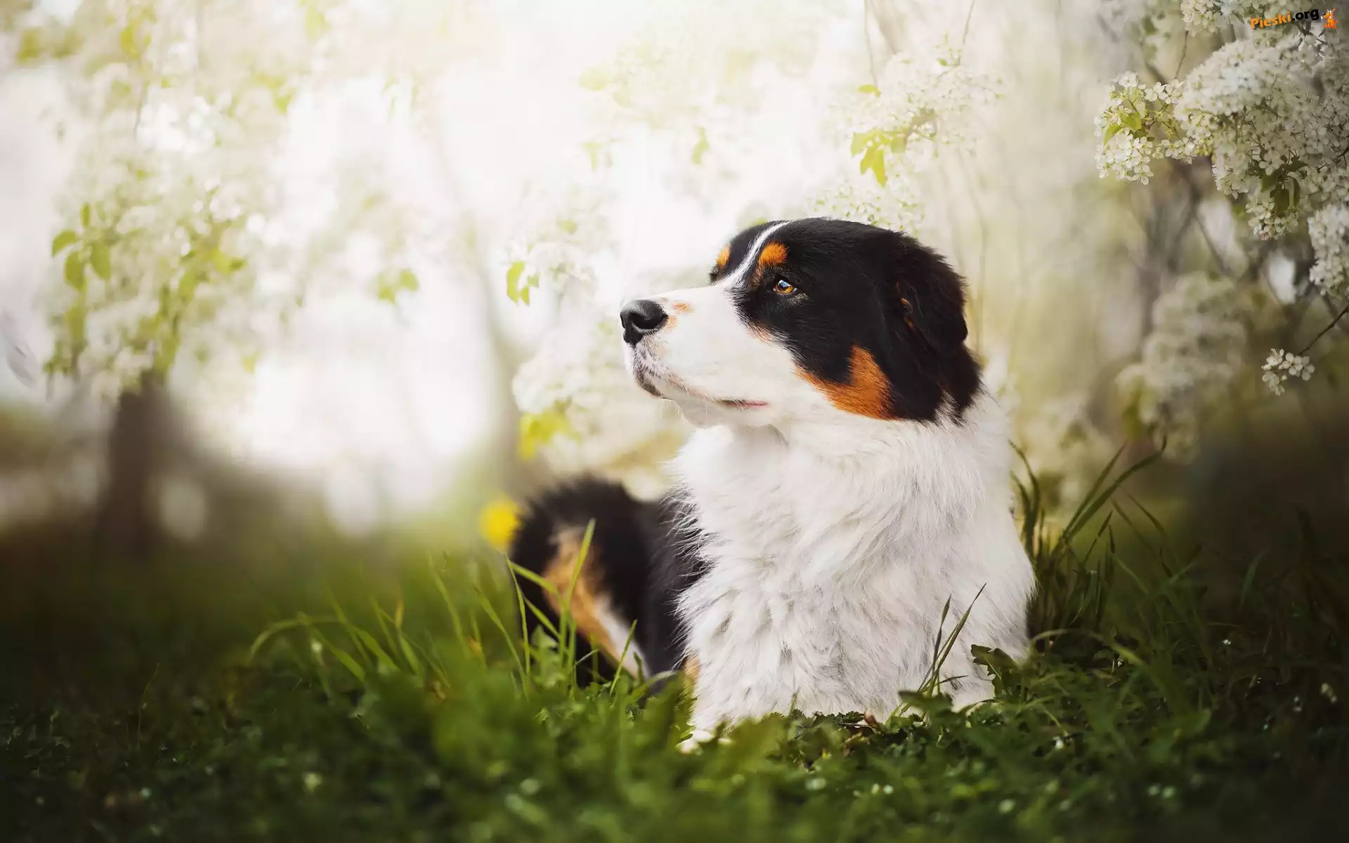 Australian shepherd, Leżący, Owczarek Australijski, Kwiaty, Pieski
