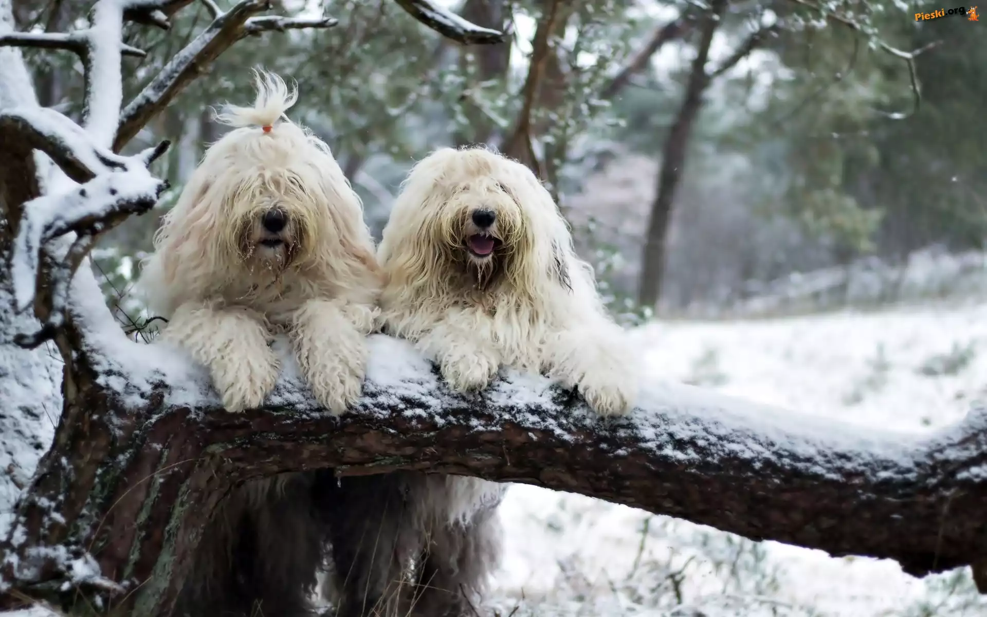 Bobtail, Dwa, Zima, Śnieg, Psy, Białe, Owczarki staroangielskie, Drzewo, Pieski