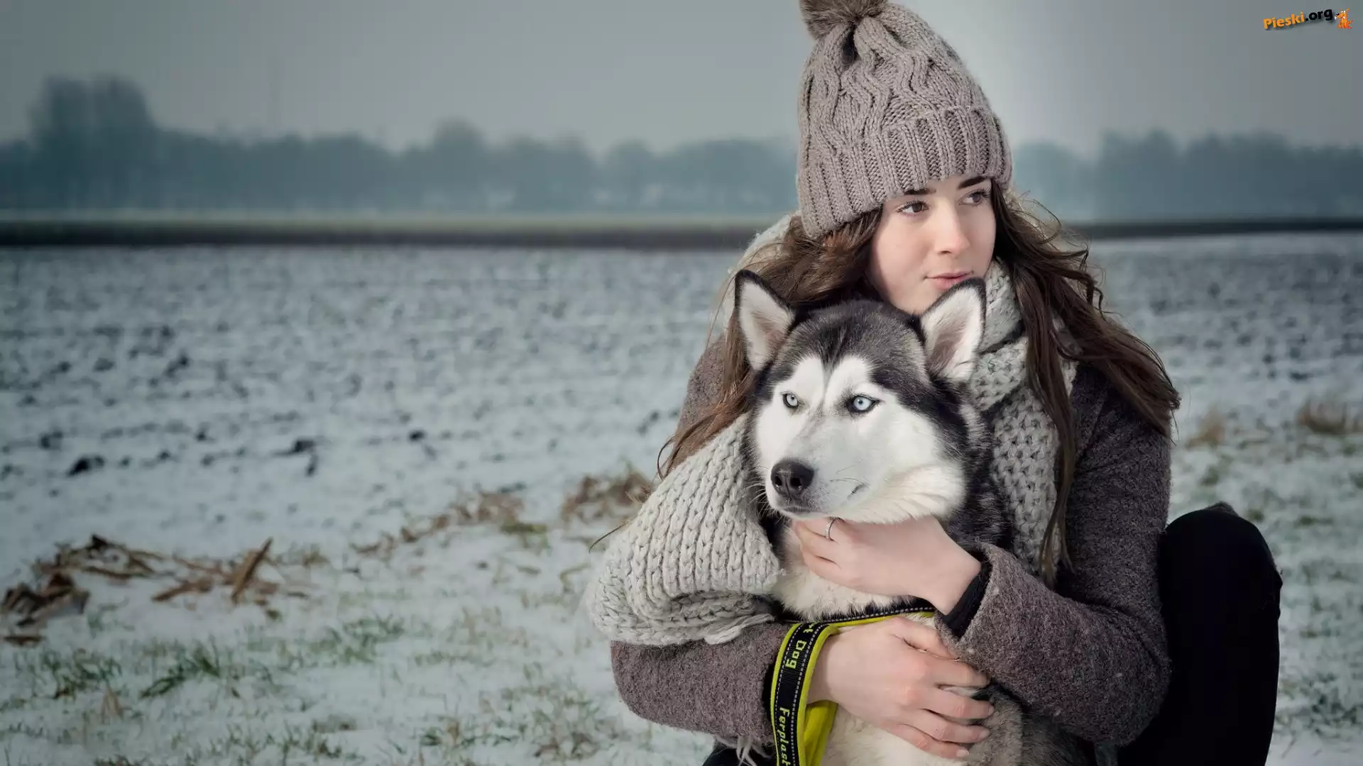 Pies, Dziewczyna, Pole, Siberian husky, Czapka, Szalik, Pieski