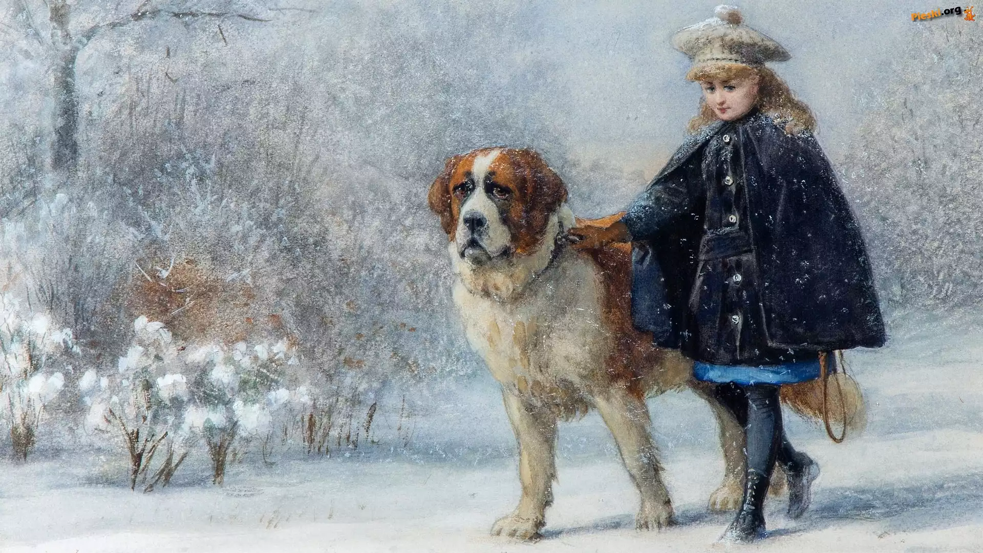 Bernardyn, Obraz, Otto Eerelman, Pies, Malarstwo, Zima, Dziewczynka