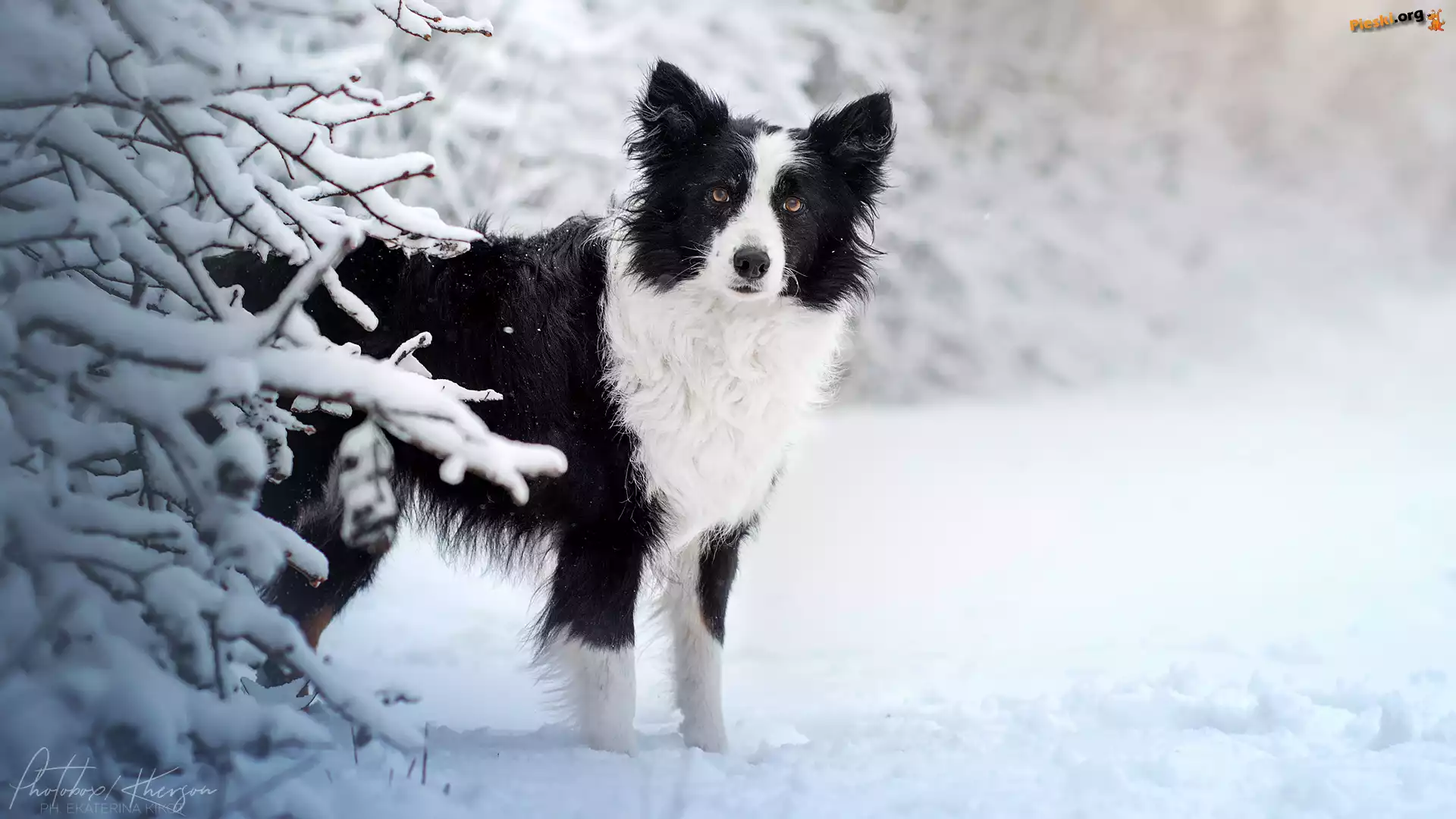 Śnieg, Biało-czarny, Ośnieżone, Pies, Border collie, Zima, Gałązki, Pieski