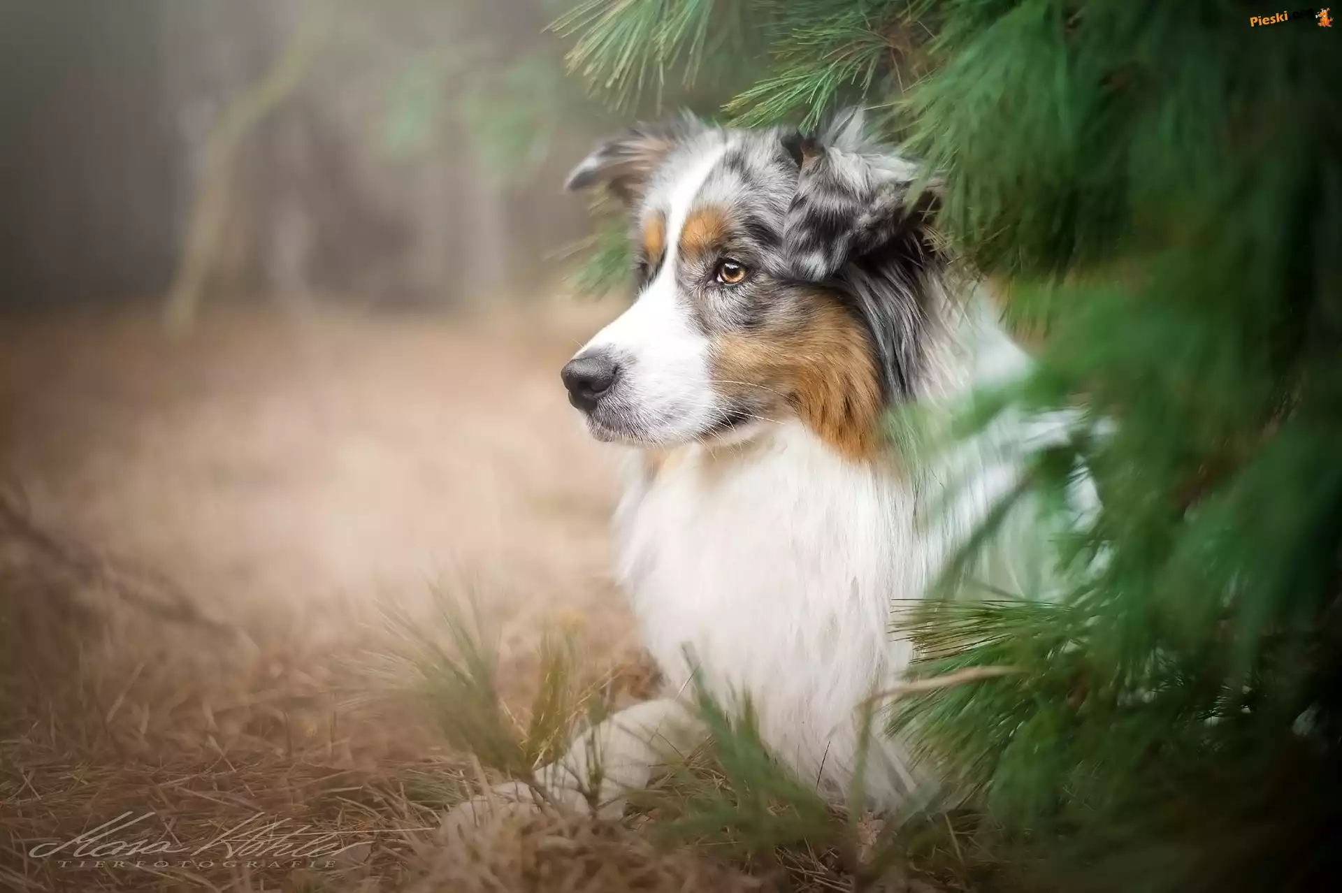 Owczarek australijski-australian shepherd Mordka, Owczarek australijski, Australian shepherd, Drzewo Psy, Pasterskie, Droga Spojrzenie, Jesień, Jesienne, Owczarek, Pies, Australijski, Liście