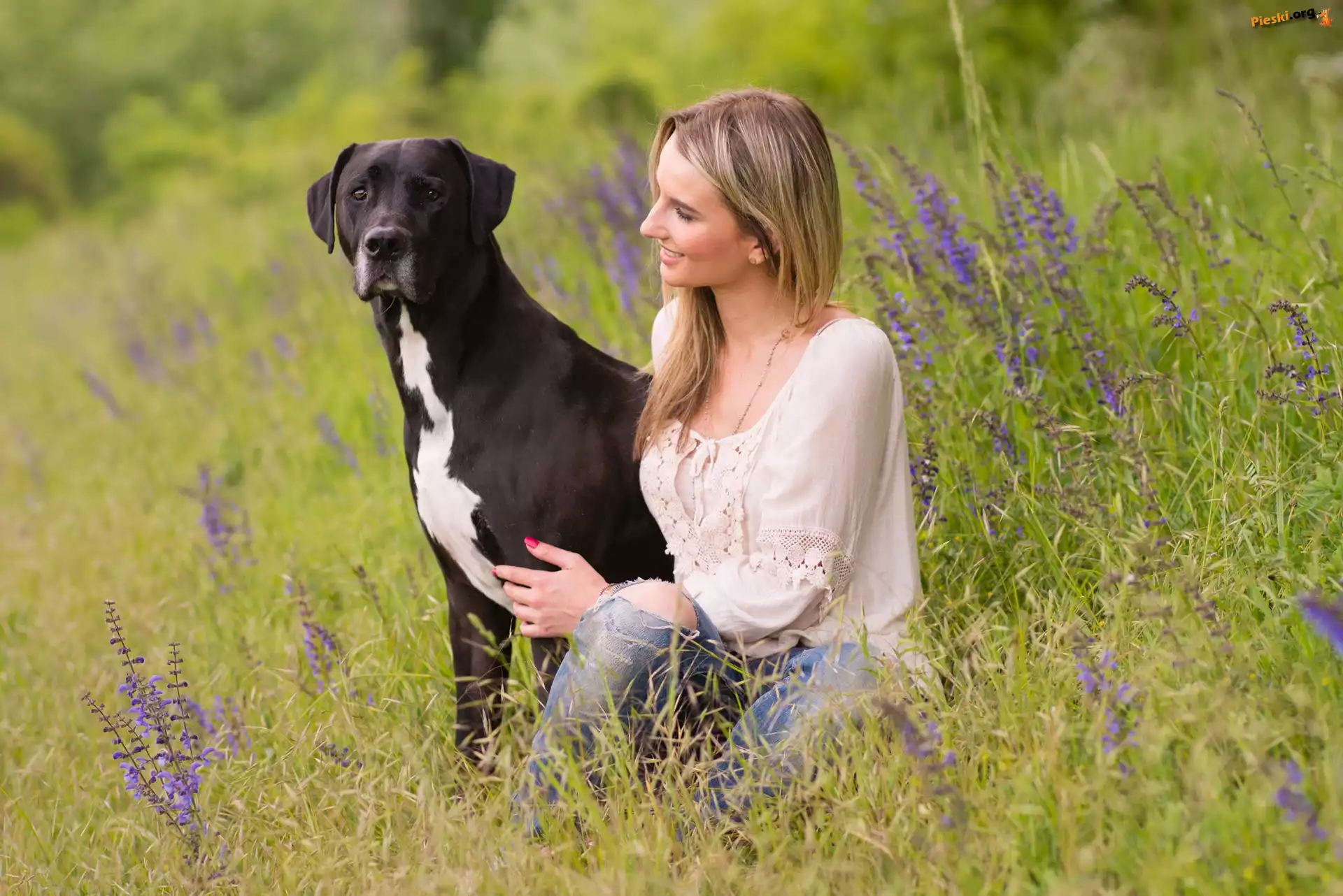 Łąka, Pies, Kobieta, Kwiaty
