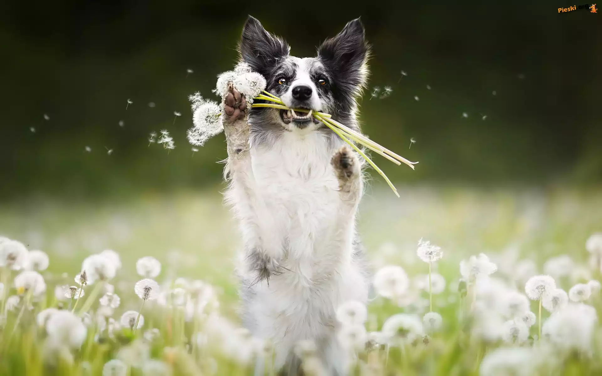 Dmuchawce, Łąka, Pies, Border collie, Pieski