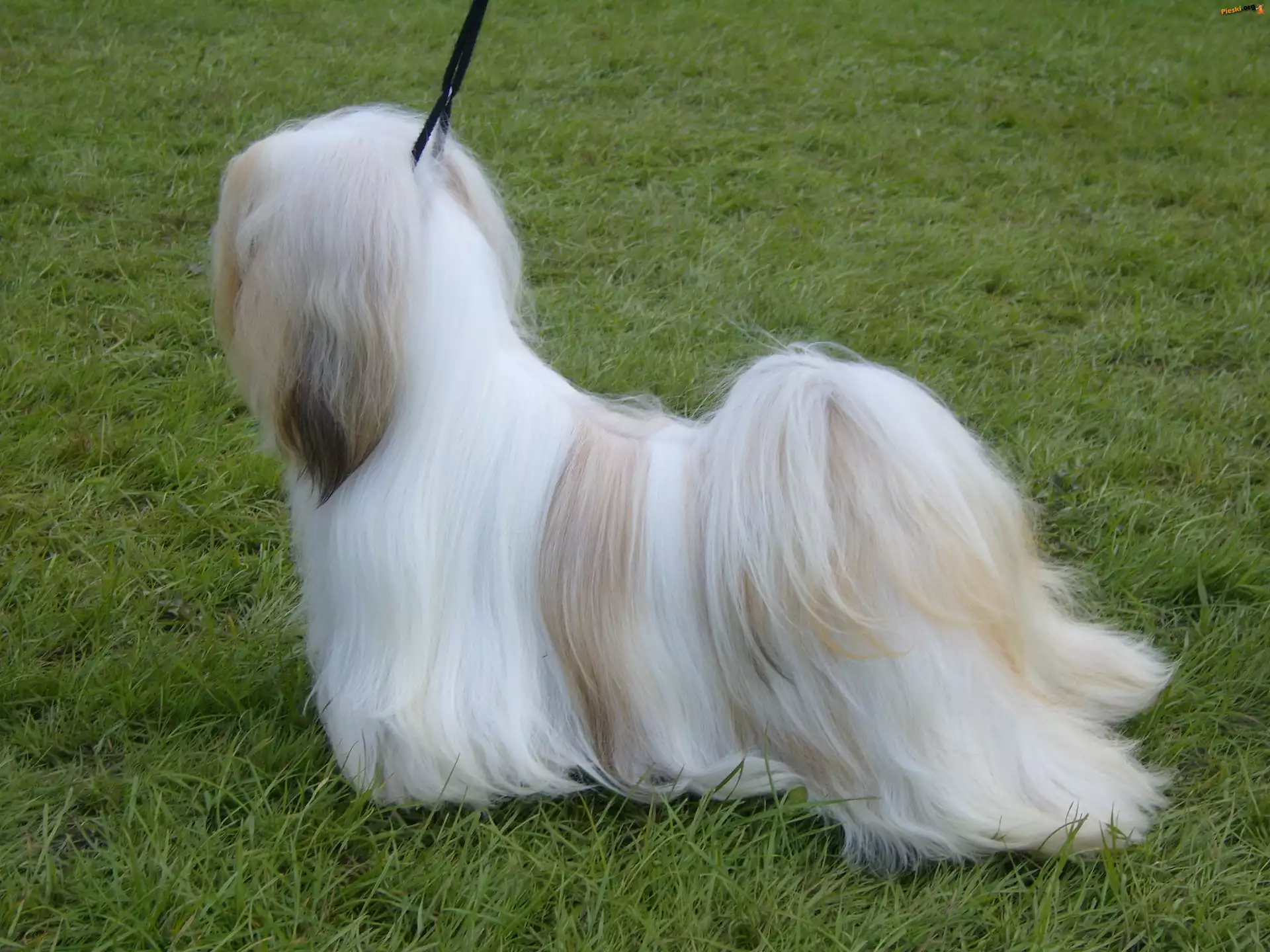 Pies, Różowa, Gerbera, Lhasa Apso Lhasa Apso, kokardka wyczesany, Lhasa Apso Lana Del Rey, Pies, Lhasa Apso Malutki piesek, Lhasa Apso