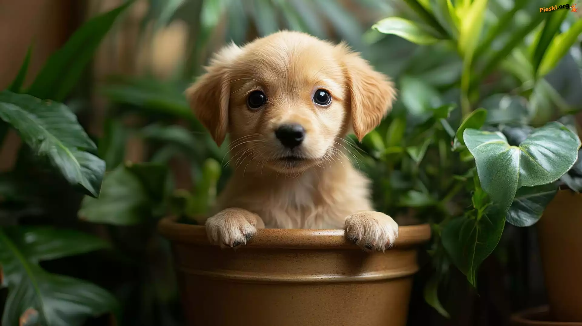 Spojrzenie, Liście, Pies, Donica, Szczeniak