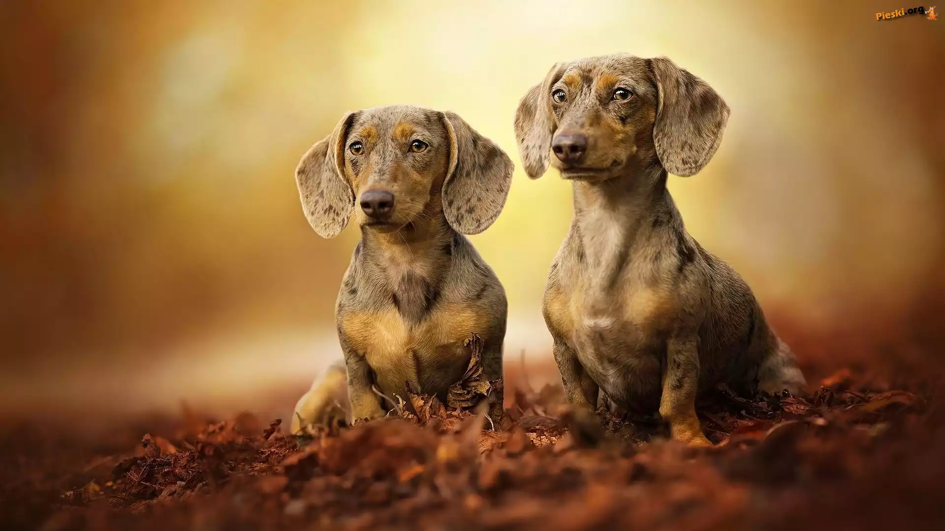 Liście, Dwa, Psy, Jamniki, Rozmyte tło, Pieski