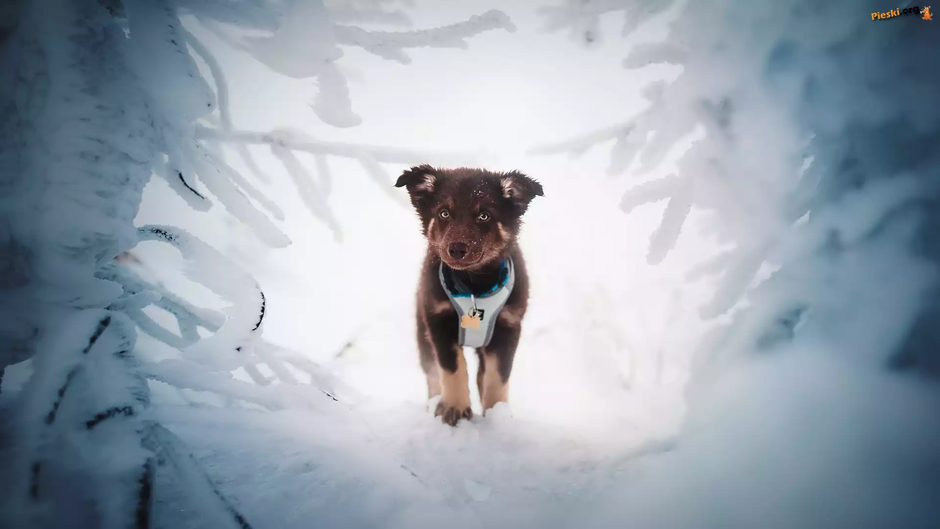 Ośnieżone, Szczeniak, Pies, Szelki, Gałązki, Pieski