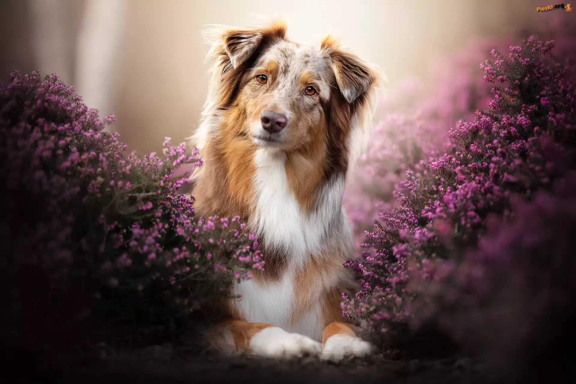 Owczarek australijski, Pies, Brązowo-biały, Wrzosy, Pieski