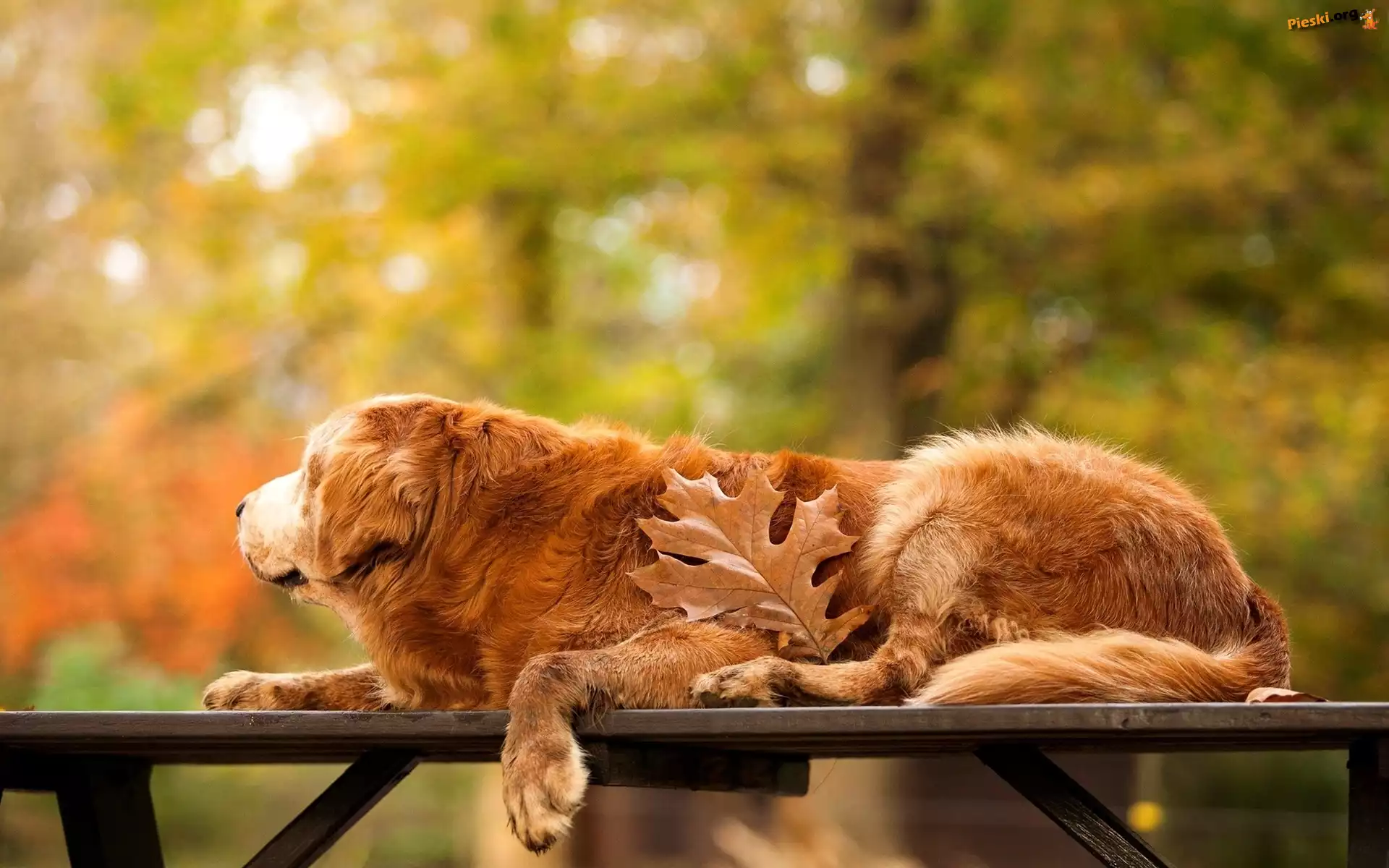 Ławka, Retriever, Golden, Park, Liść, Pieski