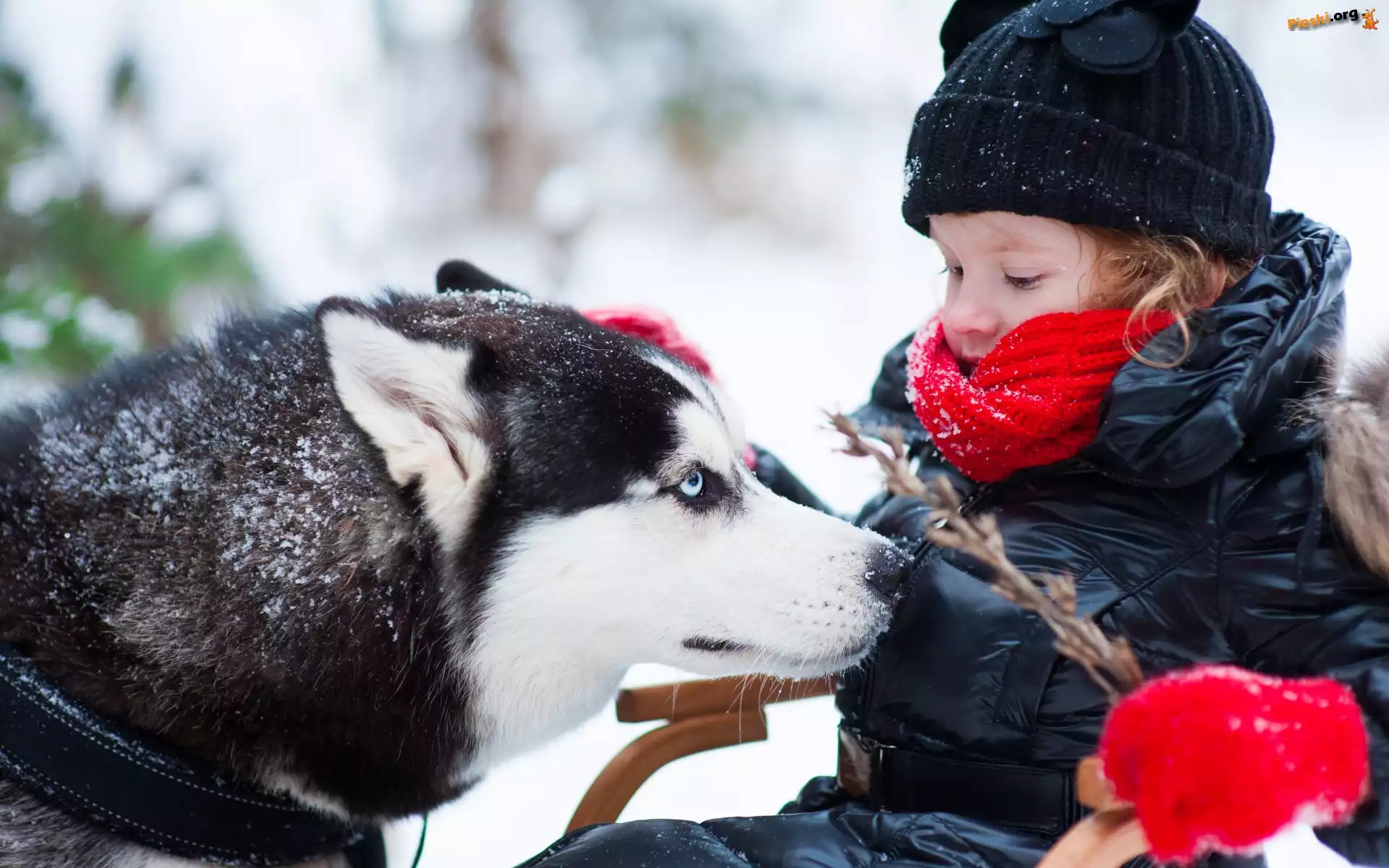 Pies, Zima, Dziecko, Gałązka, Siberian Husky, Pieski