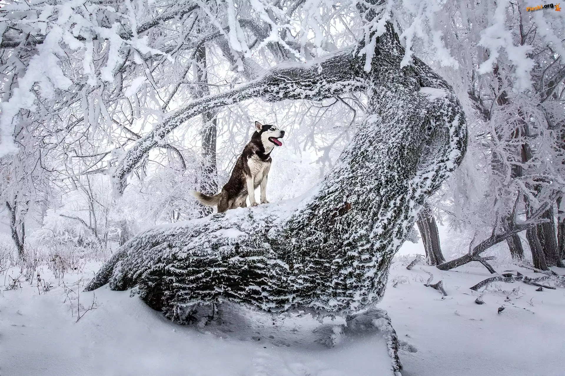 Pies, Zaśnieżone, Zima, Drzewa, Siberian Husky