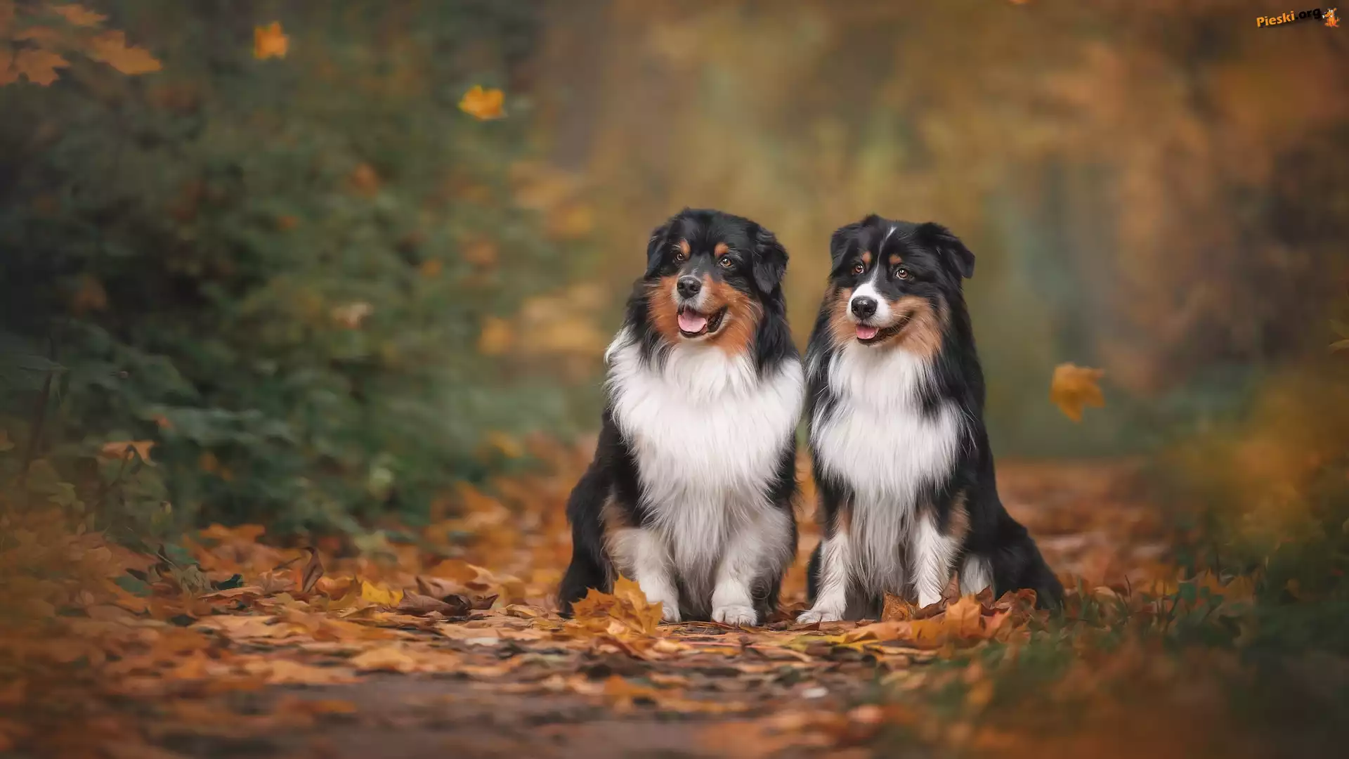 Owczarki australijskie, Suche, Psy, Liście, Dwa, Pieski