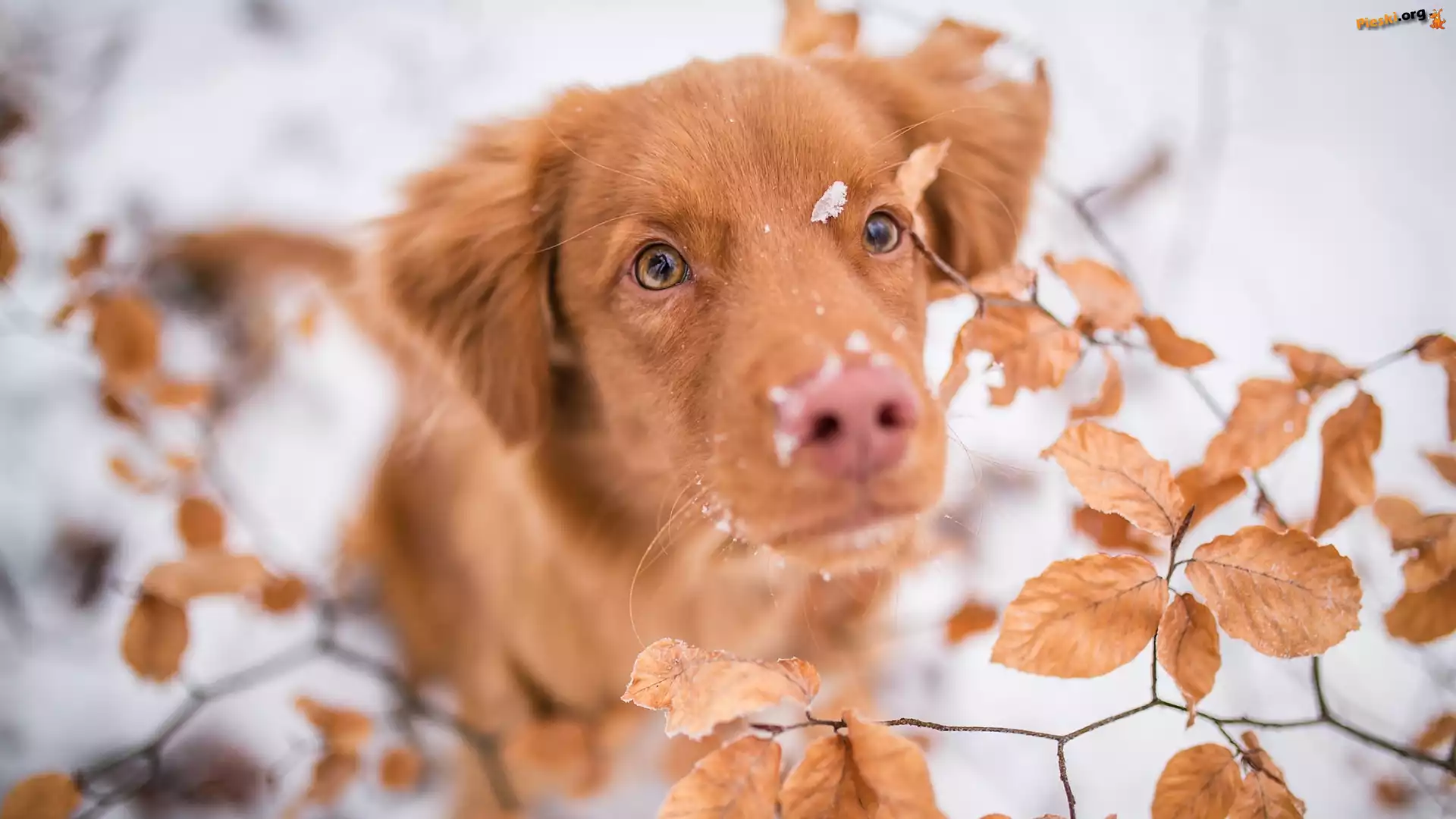 Liście, Retriever z Nowej Szkocji, Pies, Mordka, Śnieg