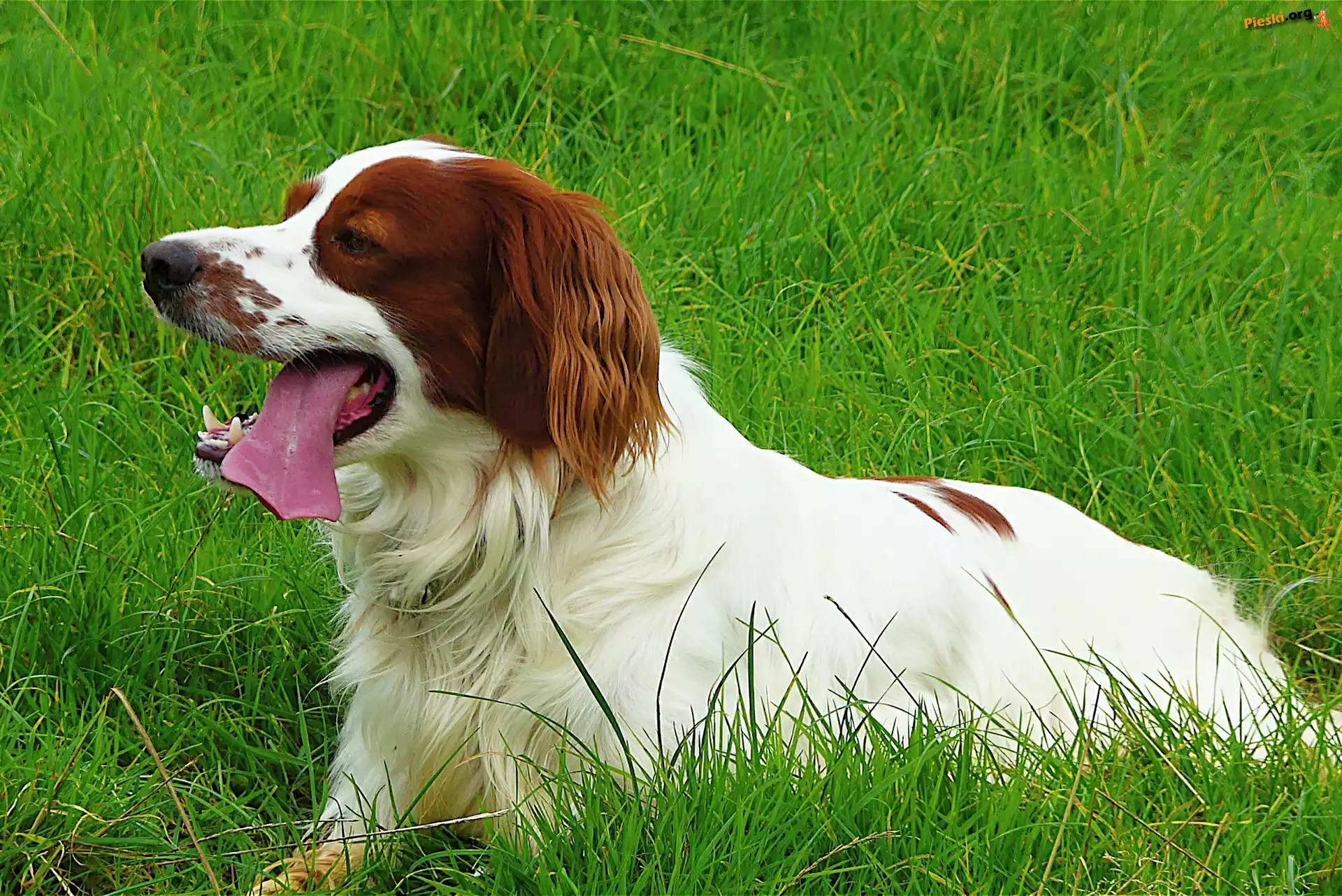 młoda, Seter irlandzki czerwono-biały, język, trawa, Pieski