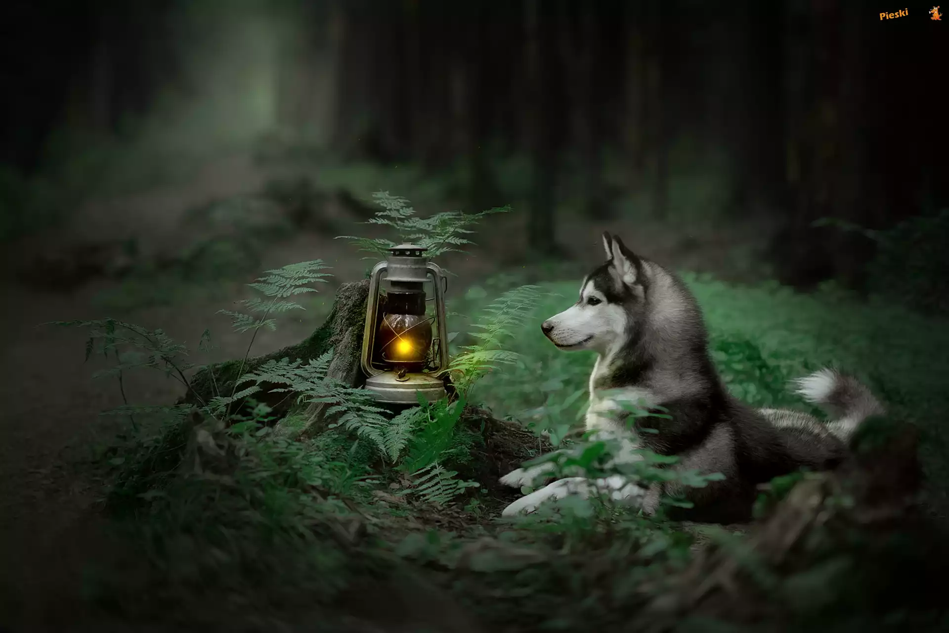 Siberian husky, Pies, Paprocie, Lampa naftowa, Pieski