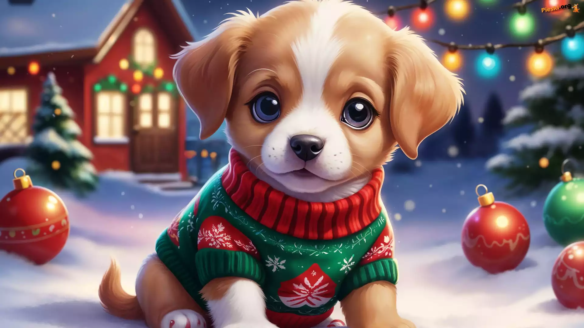 Bombki, Ubranie, Dom, Grafika, Światła, Zima, Pies, Śnieg, Pieski