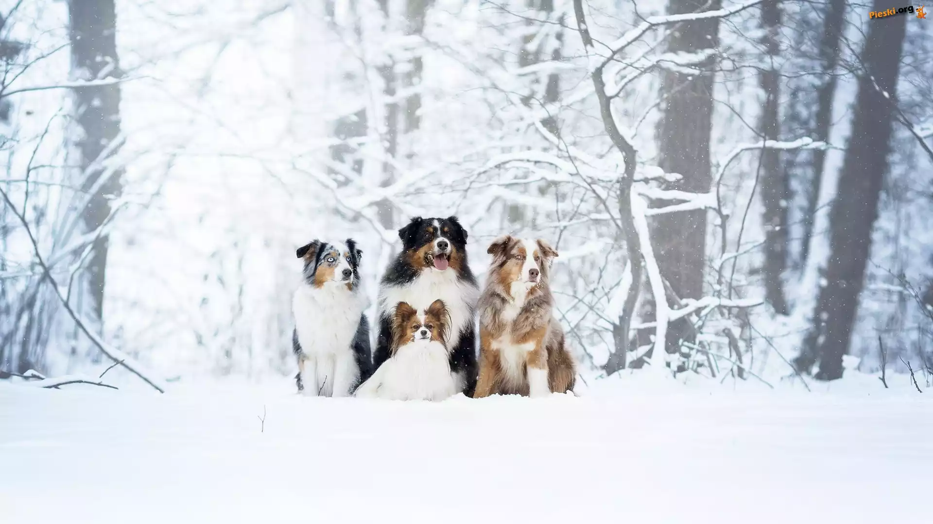 Spaniel kontynentalny miniaturowy Papillon, Cztery, Zima, Owczarek australijski, Psy, Berneński pies pasterski, Drzewa |