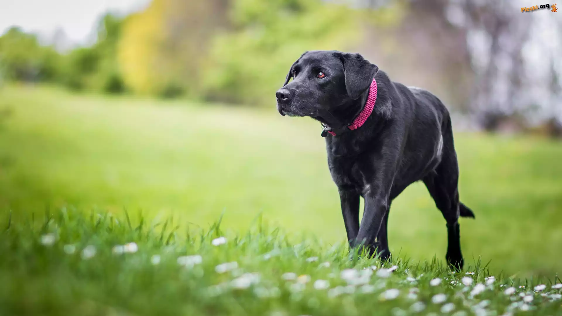 Trawa, Pies, Czarny, Obroża, Kwiaty