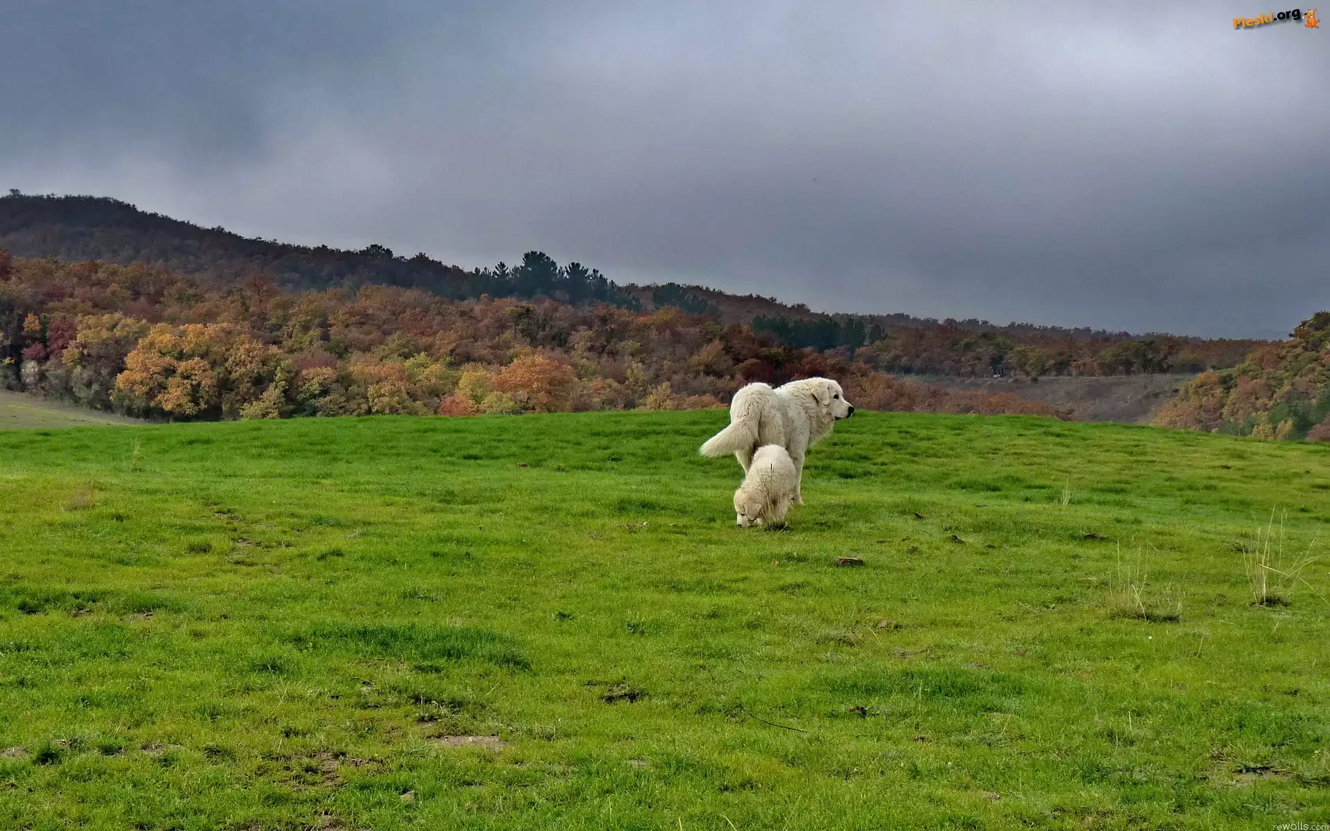 Owczarek podhalański, zielona, trawa Mordka, Polskiego owczarka podhalańskiego Trawa, Dwa, Pieski, Niebo Pies, Owczarek Podhalański Biały, mały, piesek czerwona, Owczarek podhalański, zęby, obroża Biały, Polski owczarek podhalański, język skórzana, Głowa, Owczarka podhalańskiego, obroża