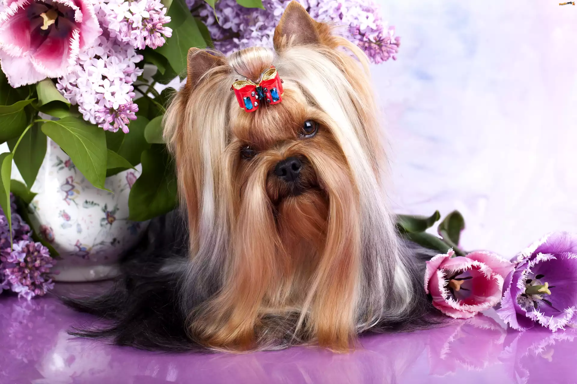 Wazon, Australian Silky Terrier, Kokardka, Kwiaty